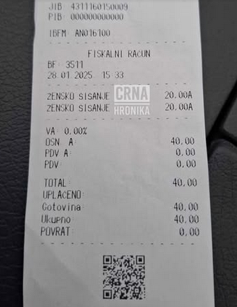 Kako navodi, šišanje nije trajalo ni deset minuta, što je dodatno izrazilo njeno nezadovoljstvo. “Tražila sam namjerno fiskalni račun da to mogu objaviti na Facebooku. Ovako pljačkaju narod, sram ih bilo,” dodala je.