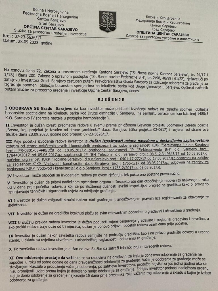 “Upravo sam potpisao i građevinsku dozvolu za izgradnju spomenika Bosanskim specijalcima, projekat koji radimo zajedno u saradnji sa veteranima ove slavne jedinice i Gradom Sarajevo. Ispravljena je još jedna višedecenijska nepravda. Za mog Špicu, za sve naše heroje. Volimo vas i mislimo na vas”, naveo je Mandić.