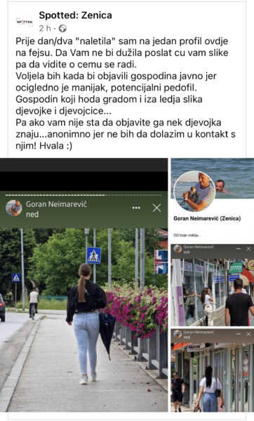 Na društvenoj mreži Facebook objavljen je zabrinjavajući post u kojem Zeničanka upozorava na manijaka koji hoda ulicama grada, fotografiše djevojke i djevojčice, a sve to onda objavljuje na svom Facebook profilu.