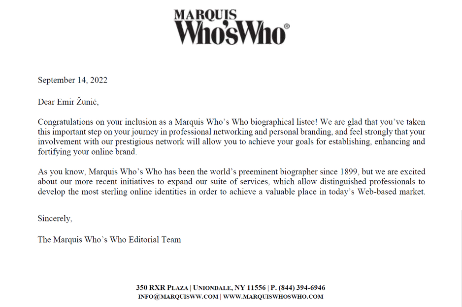 U septembru 2022. godine svoje mjesto u prestižnom američkom magazinu “Marquis Who’s Who in the World” zauzela je i biografija Emira Žunića, doktora tehničkih nauka iz Sarajeva. Ova baza obuhvata svega 3% istaknutih ljudi u svijetu iz različitih oblasti, među kojima su, između ostalih, i dobitnici Nobelovih nagrada, uspješni biznismeni te najpoznatiji naučnici. Posebno važno za istaknuti je da su ovaj i svi ostali Emirovi uspjesi ostvareni djelovanjem iz Bosne i Hercegovine.