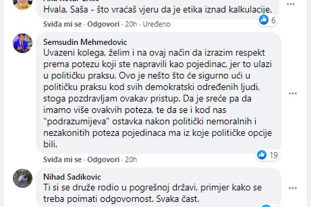 “Uvaženi kolega, želim i na ovaj način da izrazim respekt prema potezu koji ste napravili kao pojedinac, jer to ulazi u političku praksu. Ovo je nešto što će sigurno ući u političku praksu kod svih demokratski određenih ljudi. Stoga pozdravljam ovakav pristup. Da je sreće pa da imamo više ovakvih poteza, te da se i kod nas ‘podrazumijeva’ ostavka nakon politički nemoralnih i nezakonitih poteza pojedinaca, iz koje god političke opcije bili”, napisao je Mehmedović u komentaru na Magazinovićev post na Facebooku.