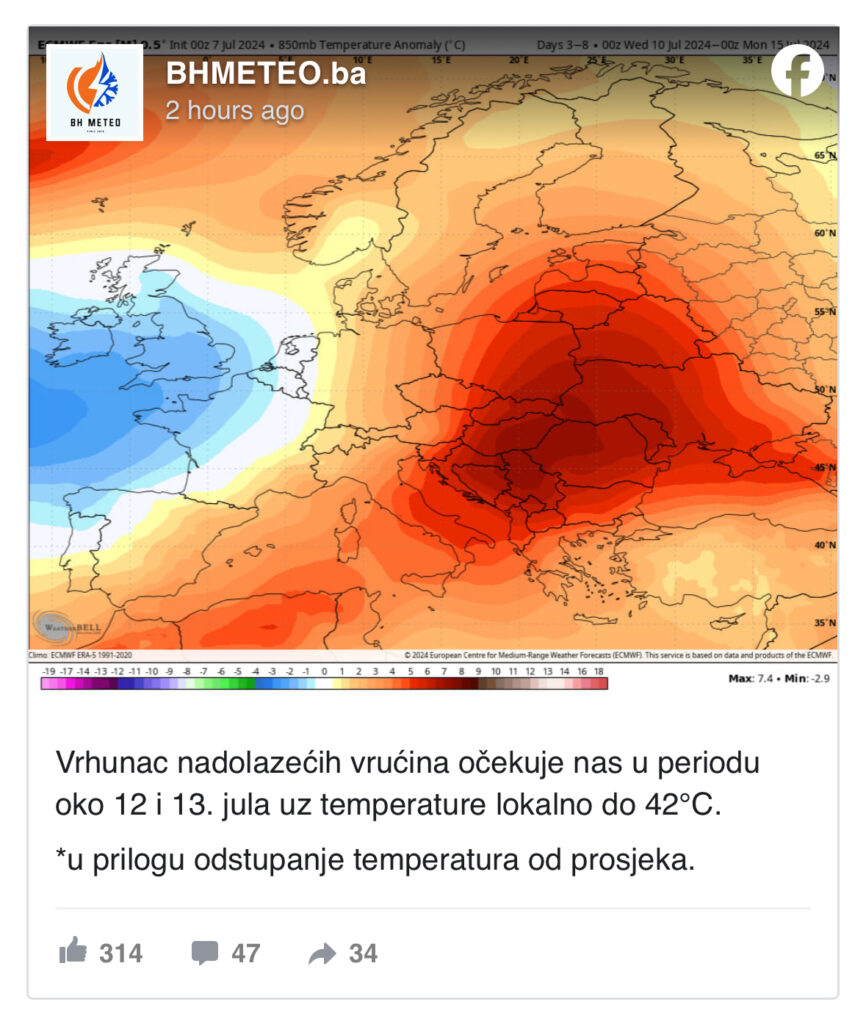 A, na stranici BHMeteo objavili su da se vrhunac nadolazećih vrućina očekuje u periodu oko 12 i 13. jula uz temperature lokalno do 42°C.