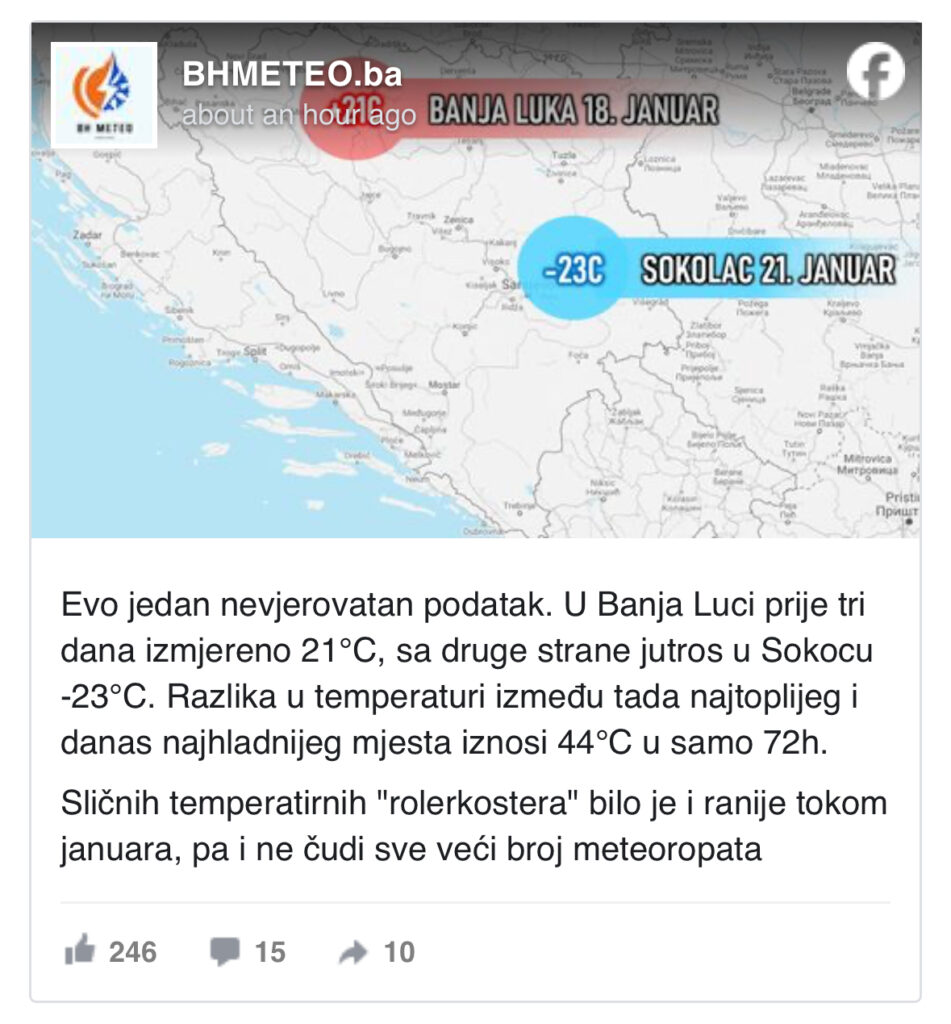 “Evo jedan nevjerovatan podatak. U Banjoj Luci prije tri dana izmjereno 21°C, sa druge strane jutros u Sokocu -23°C. Razlika u temperaturi između tada najtoplijeg i danas najhladnijeg mjesta iznosi 44°C u samo 72h.