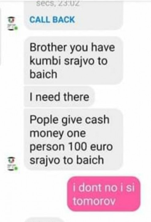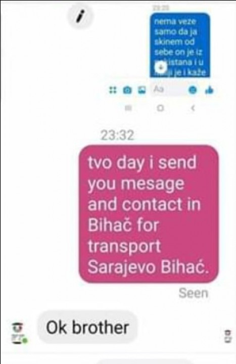 U nastavku konverzacije krijumčar se javlja migrantu i podsjeća ga da su se ”čuli prije dva dana u vezi s transportom od Sarajeva do Bihaća“, na što mu on odgovara „OK, brate“.