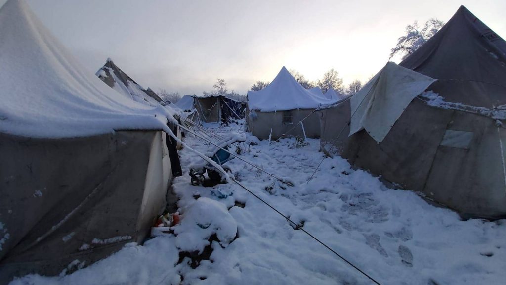 Pojedini šatori u kojima su smješteni migranti urušili su se pod težinom snijega, a migranti su prvi ovosezonski snijeg dočekali u papučama.
