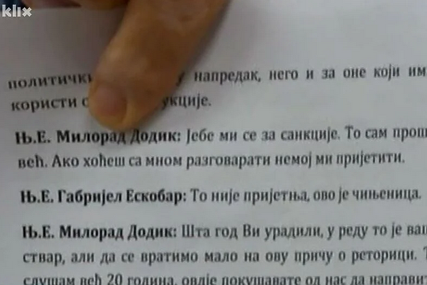 “Želim da kažem da sam vidio jedno nekorektno postupanje Američke amabasade u Sarajevu koja je dala saopćenje povodom mog razgovora s gospodinom Escobarom. Ja nisam bio spreman da izađem u javnost sa detaljima tog razgovora, ali imajući u vidu da su oni odlučili da kažu samo ono što su oni rekli, a vezano je za prijetnje nekim sankcijama”, kazao je Dodik, a zatim pročitao i pokazao stenogram sa jučerašnjeg sastanka.