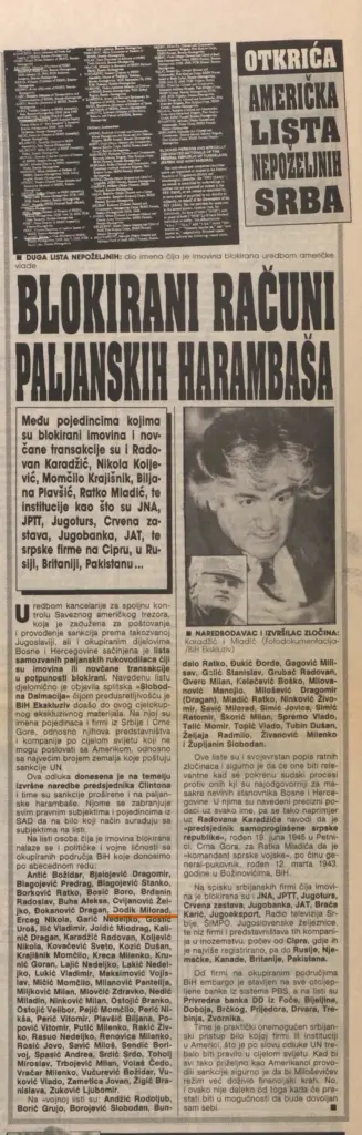 U arhivi Infobiroa pronašli smo tekst iz 1995. godine “Blokirani računi paljanskih harambaša” koji je objavio tadašnji list “BiH ekskluziv”, u kojem je objavljena informacija iz “Slobodne Dalmacije” da su pojedincima i firmama iz Srbije, Crne Gore i Bosne i Hercegovine američke vlasti uvele sankcije.