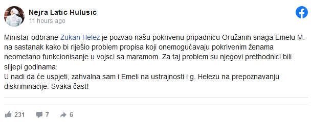 – Ministar odbrane Zukan Helez je pozvao našu pokrivenu pripadnicu Oružanih snaga Emelu M. na sastanak kako bi riješio problem propisa koji onemogućavaju pokrivenim ženama neometano funkcionisanje u vojsci sa maramom. Za taj problem su njegovi prethodnici bili slijepi godinama.