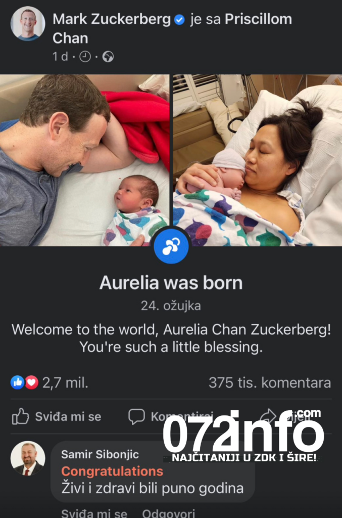 Naime, Mark Zuckerberg objavio je kako je njegova supruga na svijet donijela djevojčicu Aureliju, a to je bilo dovoljno da mu i ministar Šibonjić čestita na ovoj prinovi.