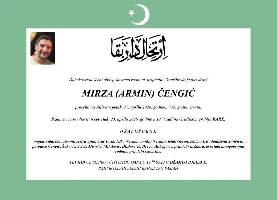 Mirza Čengić (35), državljanin Bosne i Hercegovine, preminuo je 17. aprila nedugo nakon što je pregledan u Zavodu za hitnu medicinu Zadarske županije, potvrdili su nadležni.
