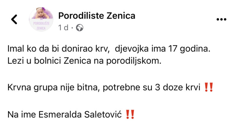 “Imal ko da bi donirao krv, djevojka ima 17 godina. Lezi u bolnici Zenica na porodiljskom”.