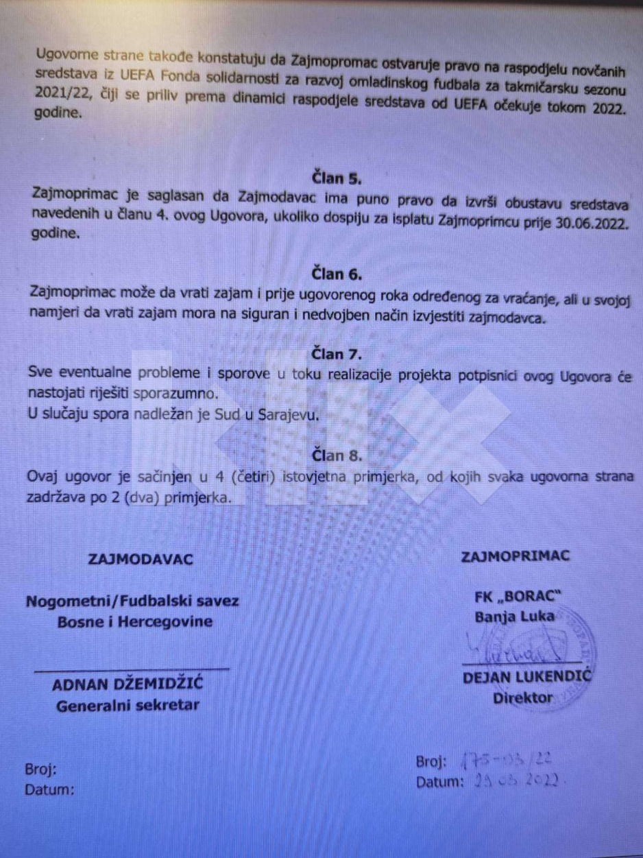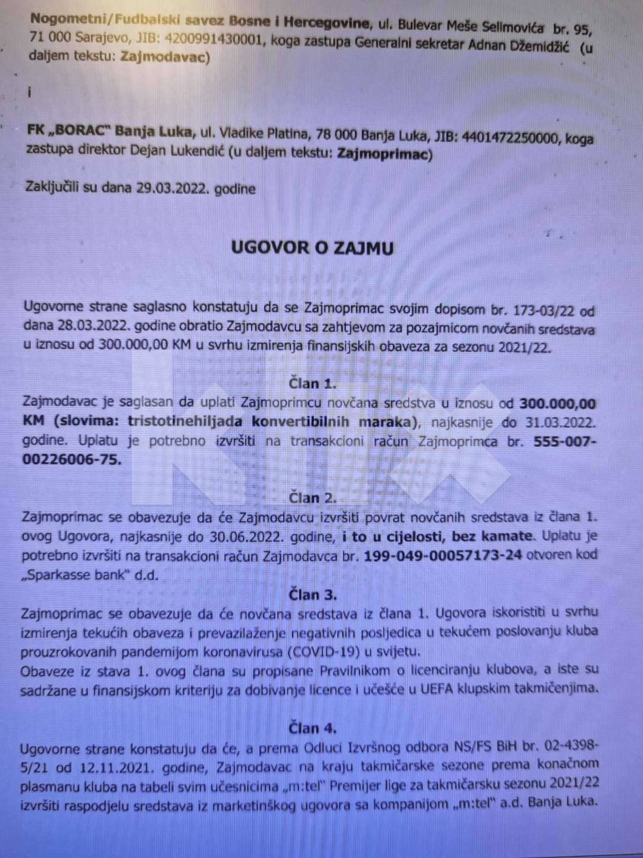 U ugovoru o pozajmici koji je zaključen i potpisan dan kasnije (29. mart) stoji da je Savez saglasan da uplati Borcu 300.000 KM najkasnije do 31. marta.