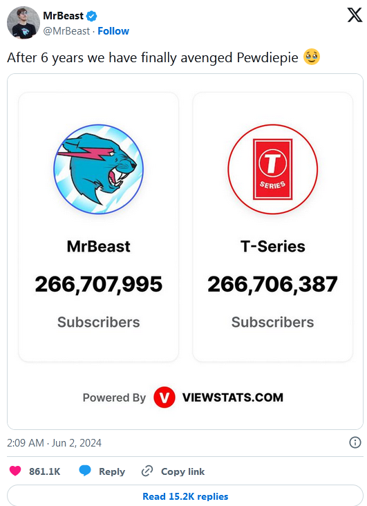 MrBeast je tako premašio dugo vladajući bolivudski muzički kanal T-Series. On se uspjehom pohvalio na društvenim mrežama, navodeći kako je “osvetio” Feliksa Kjelberga (Felix Kjellberg), poznatijeg kao PewDiePie.