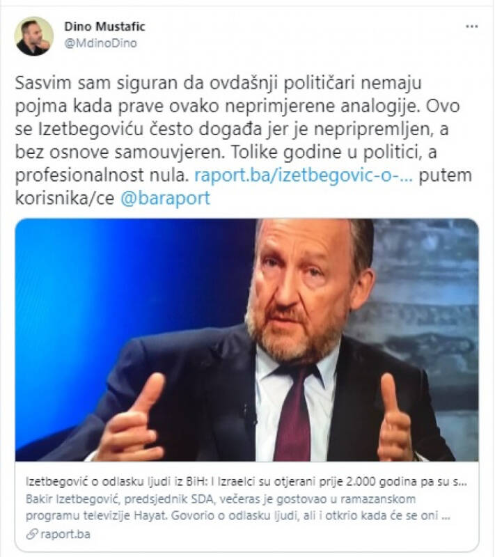 – Sasvim sam siguran da ovdašnji političari nemaju pojma kada prave ovako neprimjerene analogije. Ovo se Izetbegoviću često događa jer je nepripremljen, a bez osnove samouvjeren. Tolike godine u politici, a profesionalnost nula, napisao je Mustafić.