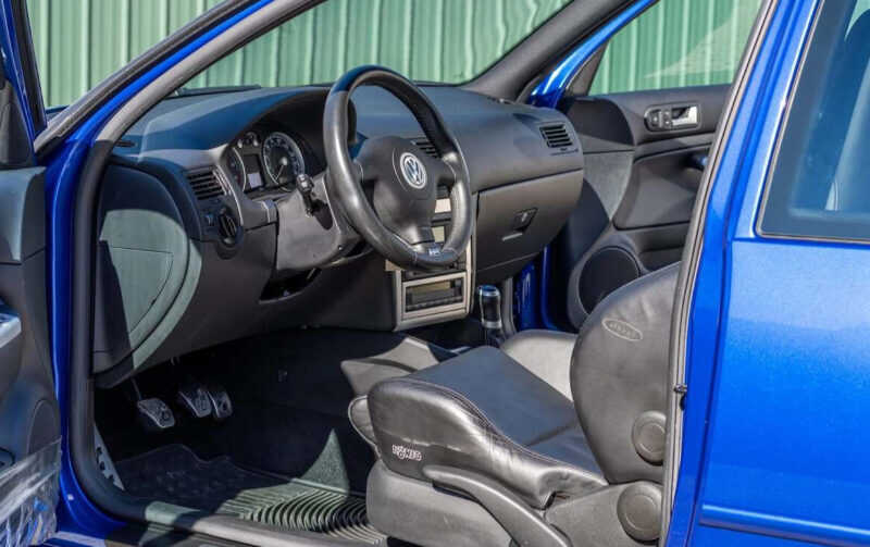 Unutrašnjost predstavlja pravu vremensku kapsulu, tu su Konig sportska sjedišta presvučena očuvanom crnom kožom s R oznakama na naslonima za glavu. Aluminijski detalji ostavljaju sportski osjećaj, kao i pločice na pragovima s R32 oznakom, a tu su i aluminijske papučice. Golf četvrte generacije je poznat po kvaliteti izrade koja je evidentna.