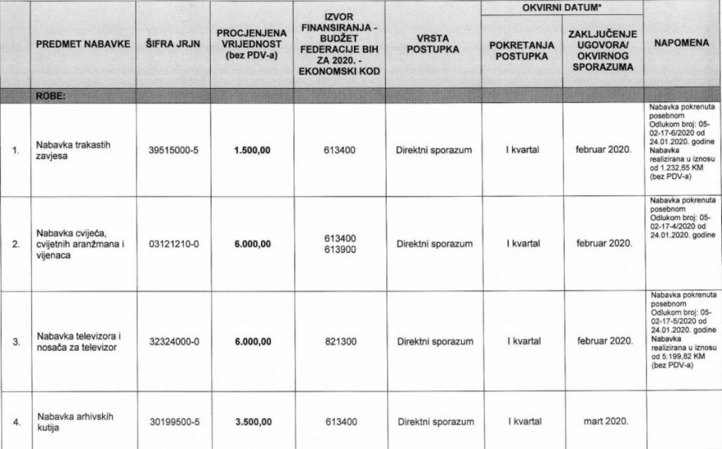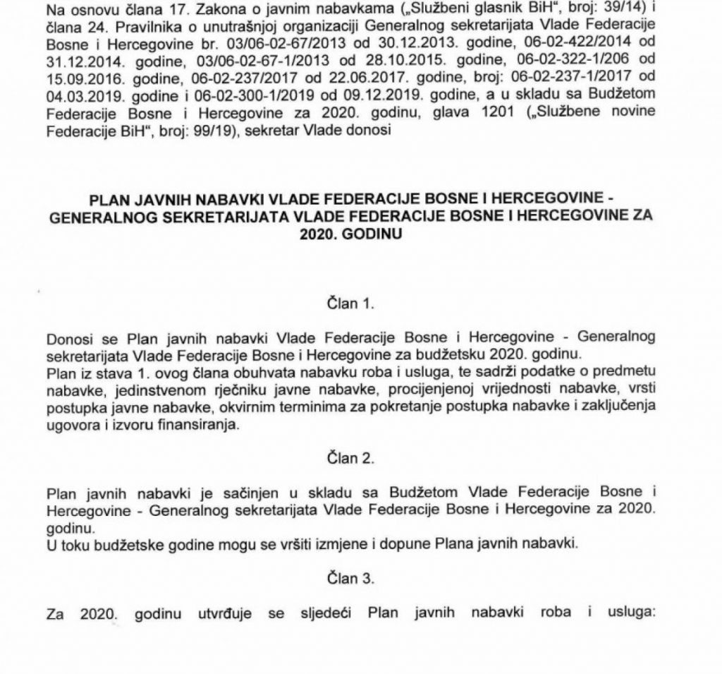 Generalni sekretarijat Vlade Federacije BiH objavio je Plan javnih nabavki za ovu godinu, prema kojem će za robe i usluge biti dato nešto više od 500.000 KM.