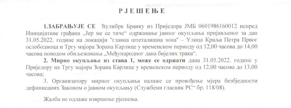 “Ukoliko je policija imala dojave o pripremama nasilničkog ponašanja trebala je postupati prema tim licima i grupama a ne ograničavati pravo na mirno okupljanje inicijativi Jer me se tiče, koja dostojanstveno godinama održava komemoracije za ubijene prijedorske civile. Uputili smo žalbu Ministarstvu unutrašnjih poslova RS ali ona ne odlaže rješenje o zabrani i ograničenju. Prije deset godina je ista policijska uprava zabranila komemoraciju za 266 ubijenih žena i djevojčica u Prijedoru”, podsjećaju.