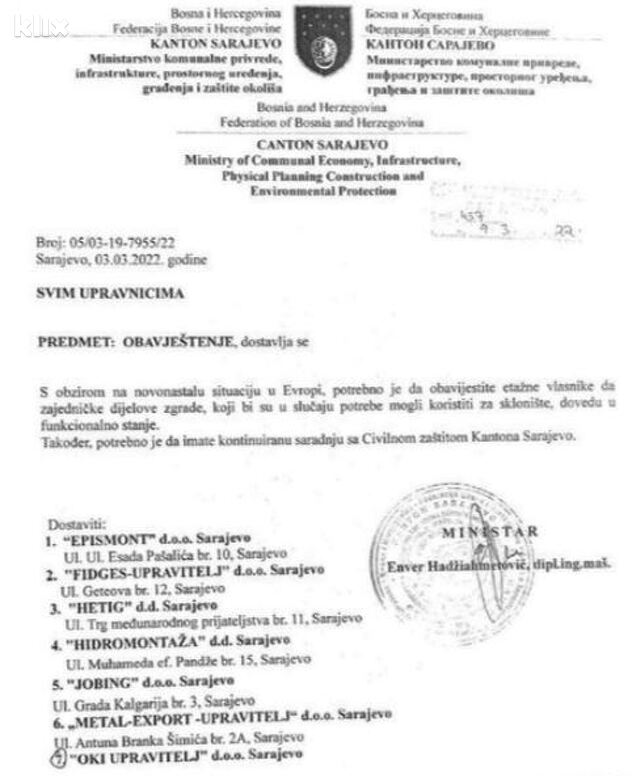 Resorno kantonalno ministarstvo u Sarajevu je zatražilo od stanara u stambenim zgradama da učine funkcionalnim zajedničke dijelove zgrada, a koji se mogu koristiti kao sklonište. Zatražena je reakcija i Civilne zaštite. Ovu informaciju za Klix.ba je potvrdio Enver Hadžiahmetović, kantonalni ministar komunalne privrede, infrastrukture, prostornog uređenja i zaštite okoliša.