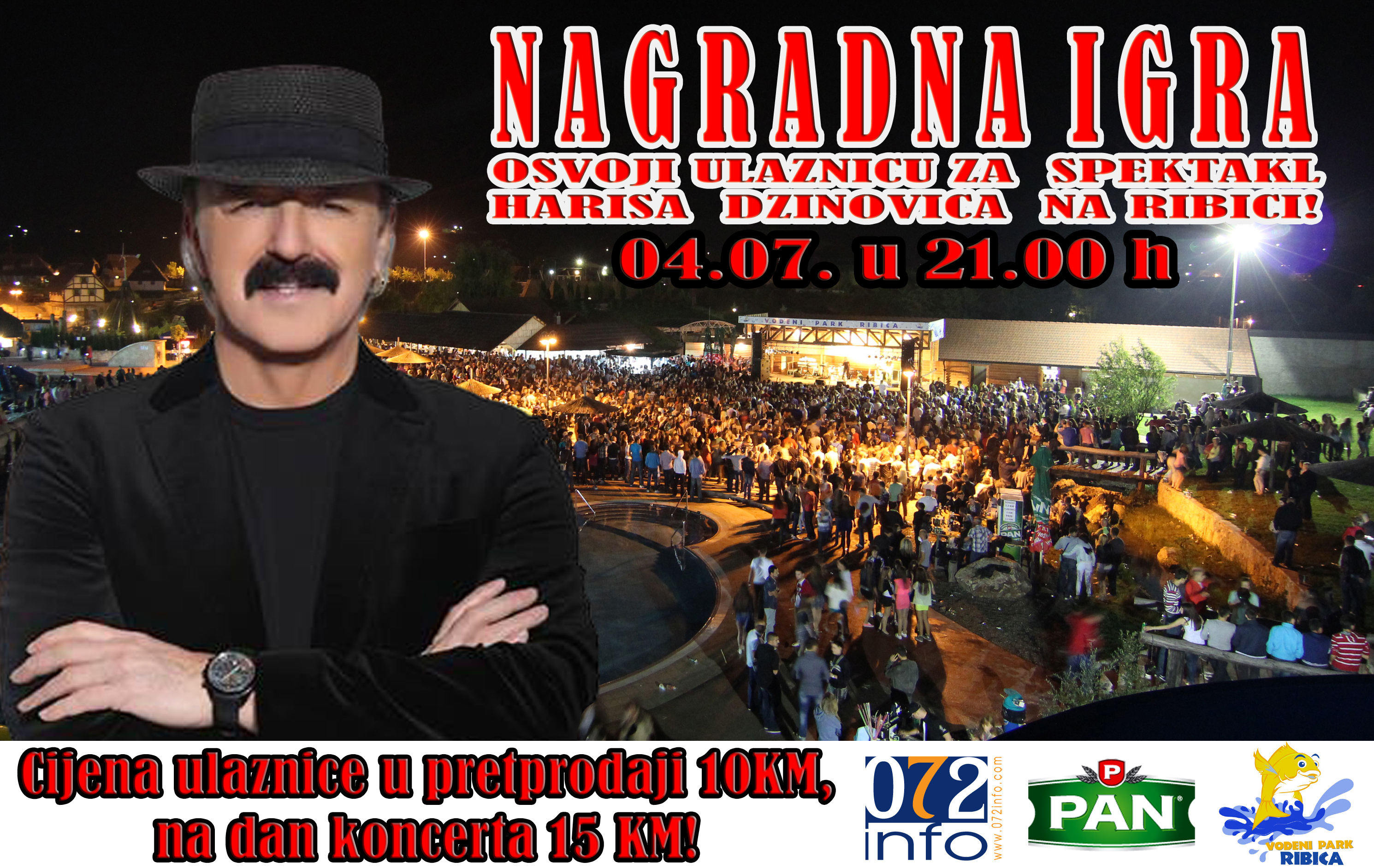 Portal 072info u saradnji sa Vodenim parkom 'Ribica' u Vitezu nagrađuje svoje čitatelje sa deset ulaznica za veliki koncertni spektakl koji je pred nama. Sve što je neophodno uraditi jeste biti član naše Facebook stranice, te podijeliti fotografiju (plakat) za koncert Harisa Džinovića na kojem se nalazi natpis NAGRADNA IGRA a koju smo objavili na našoj Facebook stranici. Fotografiju možete pronaći klikom OVDJE. Svim učesnicima želimo puno sreće, a imena sretnih dobitnika objavit ćemo na našoj Facebook stranici u srijedu (03.07.), tačno u 23.00 sata. Sretno.