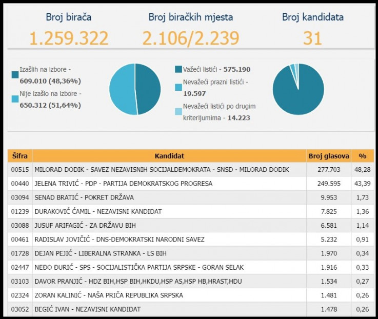 Prema najnovijim rezultatima, u vodstvu je Milorad Dodik (SNSD) sa 277.703 osvojenih glasova (48,28 posto). Jelena Trivić (PDP) je do sada osvojila 249.595 glasova, to jeste 43,39 posto.