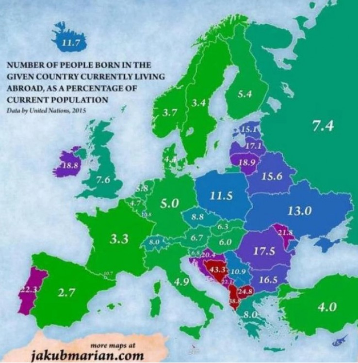 Na osnovu podataka koje je analizirao Jakub Marian (Marian’s),kartograf, može se zaključiti da je struktura stanovništva pojedinih država mnogo izmijenjena imigracijama. Bosna i Hercegovina za sada ima najveći procenat iseljenog stanovništva.