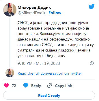 “SNSD i ja kao predsjednik poštujemo volju građana Bijeljine i uvijek smo je poštovali. Zahvaljujem svima koji su danas izašli na referendum, a posebno aktivistima SNSD-a i koalicije koji su smatrali da je smjena gradskih čelnika uslov za napredak Bijeljine”, napisao je Dodik.