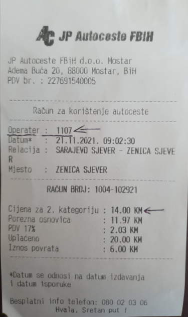 ,,Jutros 21.11.2021 na naplatnoj rampi na novom izlazu autoputa Sarajevo – Zenica Sjever, umišljena gospođa (Operatori 1107) nakon jasnih dokaza da vozimo putničko auto-kombi, sa 3 registrovana putnička sjedišta i riječima da smo i prije plaćali putarina za prvu kategoriju tj. 7 KM, ona nam naplati duplu Taxu od 14 KM i još kaže da je ona ta koja na tom mjestu odredjuje koje kategorije je koje auto i koliko će naplatiti.