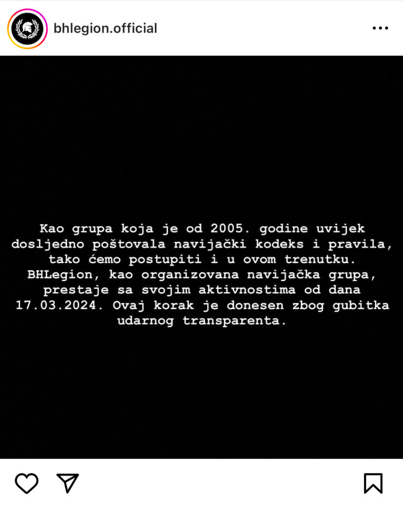 “BHLegion kao organizovana navijačka grupa, prestaje sa svojim aktivnostima od dana 17. mart 2024. godine. Ovaj korak je donesen zbog gubitka udarnog transparenta”.