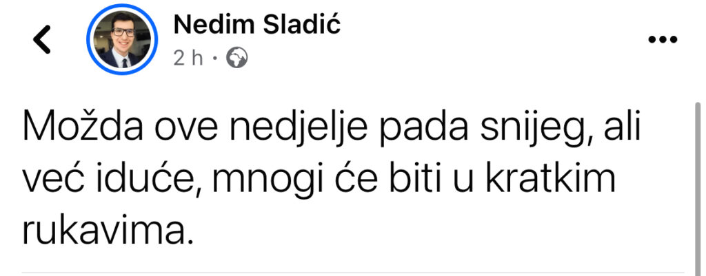 “Možda ove nedjelje pada snijeg, ali već iduće, mnogi će biti u kratkim rukavima”, napisao je Sladić.