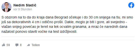 “S obzirom na to da do kraja dana Beograd očekuje i do 30 cm snijega na tlu, mi smo još sa dekorativnih 4 cm i odlično prošli. Dakle, moglo je biti i gore, ali svejedno – vlažan snijeg povećao je teret na tek ocvalim granama, a mraz će narednih dana nažalost ponovo staviti voćke na test izdržljivosti”, objavio je sladić na Facebooku.