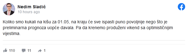 – Koliko smo kukali na kišu za 01.05, na kraju će sve ispasti puno povoljnije nego što je preliminarna prognoza uopće davala. Pa da krenemo produženi vikend sa optimističnijim vijestima – napisao je Sladić na Facebooku.