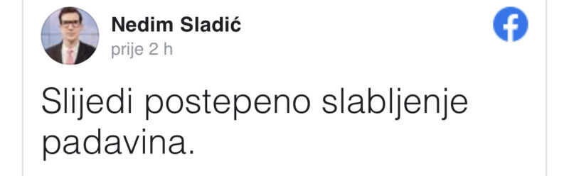 “Slijedi postepeno slabljenje padavina”, napisao je Sladić.
