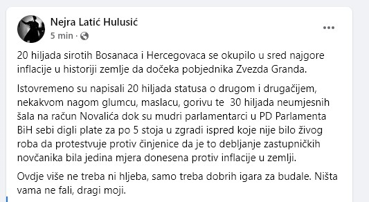 Istovremeno su napisali 20 hiljada statusa o drugom i drugačijem, nekakvom nagom glumcu, maslacu, gorivu te  30 hiljada neumjesnih šala na račun Novalića dok su mudri parlamentarci u PD Parlamenta BiH sebi digli plate za po 5 stoja u zgradi ispred koje nije bilo živog roba da protestvuje protiv činjenice da je to debljanje zastupničkih novčanika bila jedina mjera donesena protiv inflacije u zemlji. – napisala je Latić Hulusić u svojoj objavi na društvenim mrežama, a zaključak objave glasi: