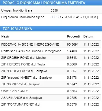 Najveći dioničar EP BiH je Federacija sa oko 90 posto udjela, a ostalo su mali dioničari.