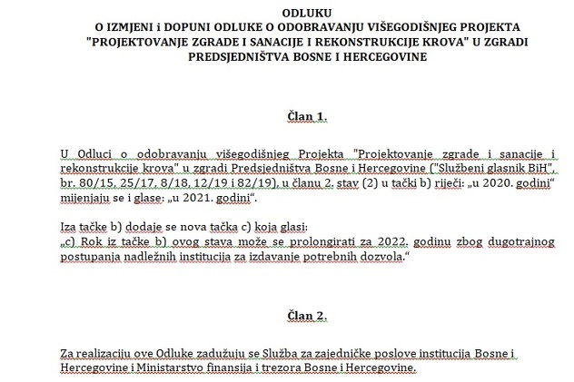 Naime, projekat oko sanacije krova zgrade Predsjedništva BiH započeo je još 2015. godine. Međutim, institucije BIH ga do danas nisu uspjele realizovati, pa je tako Vijeću ministara BiH predloženo da usvoji odluku kojom se projekat sanacije produžava čak do 2022 i to zbog “dugoročnog postupanja nadležnih institucija za izdavanje potrebnih dozvola“.