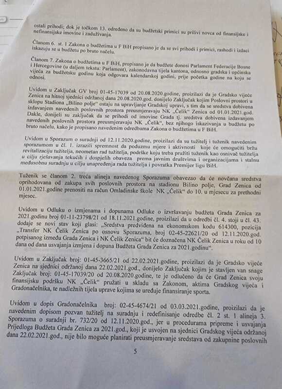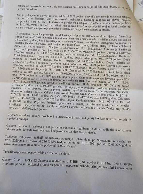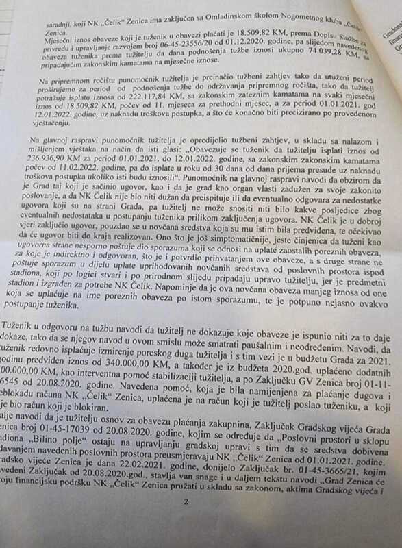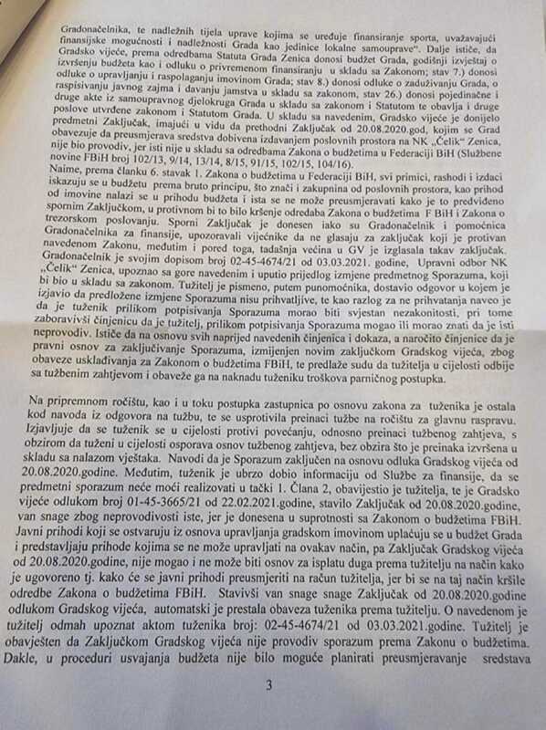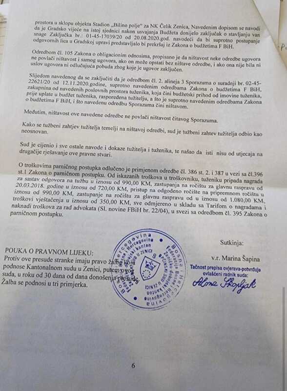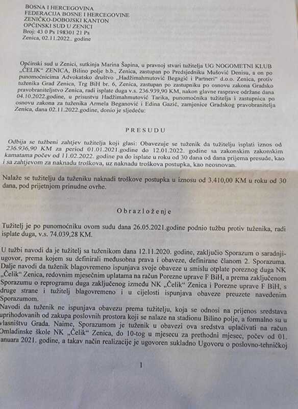 Općinski sud u Zenici donio je nepravomoćnu presudu po kojoj odbija tužbeni zahtjev NK Čelik Zenica u predmetu protiv Grada Zenica zbog kršenja Sporazuma o međusobnoj saradnji potpisanog 12.11.2020. godine.