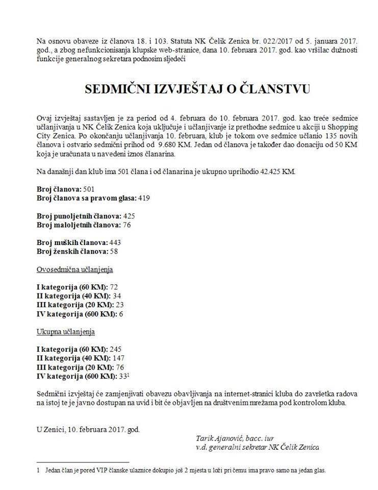 U skladu sa statutarnom obavezom, a do osposobljavanja klupske web-stranice, objavljujemo treći sedmični izvještaj o članstvu u pisanoj formi. Tokom treće sedmice, koja uključuje i prethodni vikend učlanjivanja u Shopping City Zenica, u naš klub se učlanilo 135 članova i ostvaren je ukupni prihod od članarina u iznosu od 9.860 KM. Trenutno klub ima 501 člana a sa učlanjenjem nastavlja u ponedjeljak u periodu od 12 do 18 h u prostorijama kluba. Postani Čelikov član, ostvarimo zenički san!