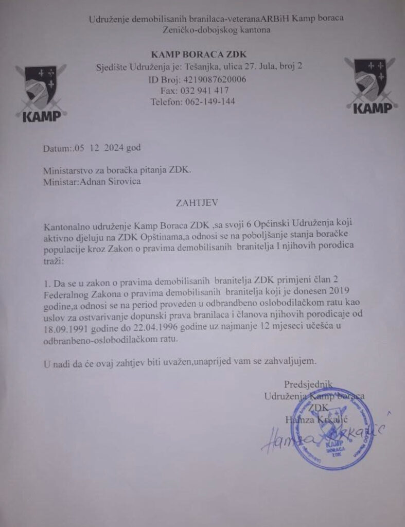 Udruženje demobilisanih boraca ZDK, poznato kao Kamp boraca, uputilo je Ministarstvu za boračka pitanja ZDK zahtjev za rješavanje nekoliko ključnih pitanja vezanih za prava demobilisanih boraca i njihovih porodica, piše 072info.