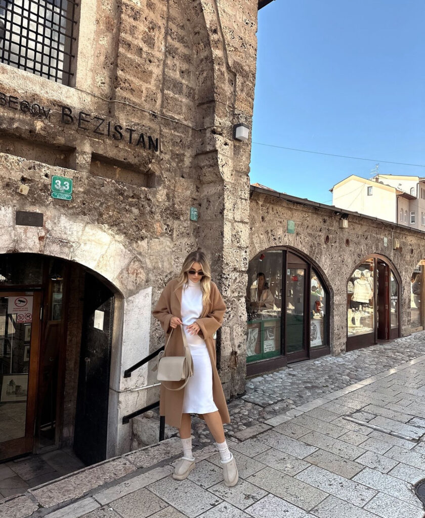 Starija sestra Ramović i ovaj put se pobrinula da izgleda savršeno u ovim toplim jesenjim danima, pa je za svoj look odabrala bijelu haljinu do koljena i smeđi kaput, a bež torbicu kombinirala je sa istobojnim uggsicama.