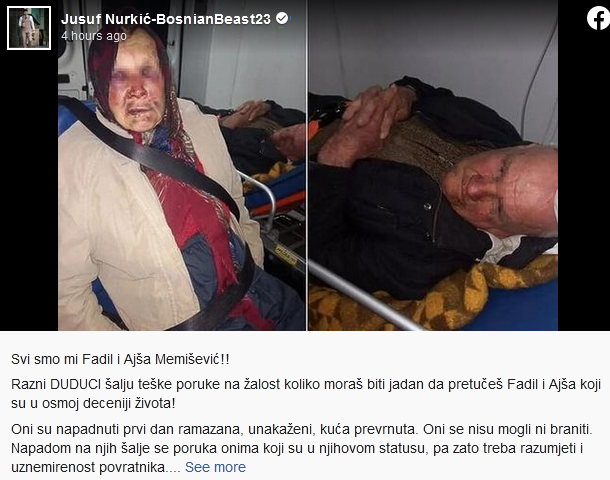 – Razni duduci šalju teške poruke na žalost koliko moraš biti jadan da pretučeš Fadil i Ajša koji su u osmoj deceniji života! Oni su napadnuti prvi dan ramazana, unakaženi, kuća prevrnuta. Oni se nisu mogli ni braniti. Napadom na njih šalje se poruka onima koji su u njihovom statusu, pa zato treba razumjeti i uznemirenost povratnika – izjavio je Memišević. Vidjet ćemo da li će biti medijski ispraćeno i da li će iko odgovarati – napisao je Nurkić.