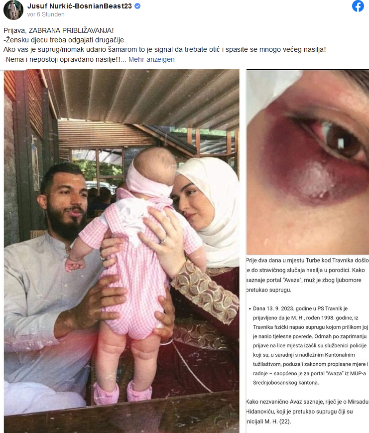 “Prijava, ZABRANA PRIBLIŽAVANJA! Žensku djecu treba odgajati drugačije. Ako vas je suprug/momak udario šamarom to je signal da trebate otić i spasite se mnogo većeg nasilja! Nema i ne postoji opravdano nasilje!! ‘Najbolji među vama su oni koji su najbolji prema ženama’”, poručio je Jusuf Nurkić.