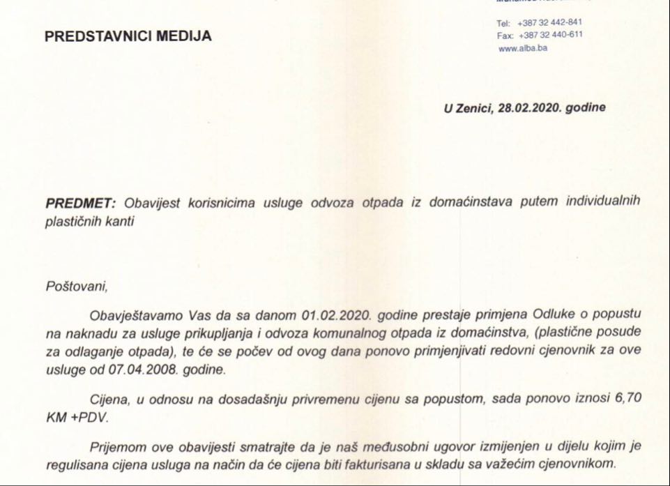 Obavještavamo Vas da sa danom 01.02.2020. godine prestaje primjena Odluke o popustu na naknadu za usluge prikupljanja i odvoza komunalnog otpada iz domaćinstva, (plastične posude za odlaganje otpada), te će se počev od ovog dana ponovo primjenjviati redovni cjenovnik za ove usluge od 07.04.2008. godine.