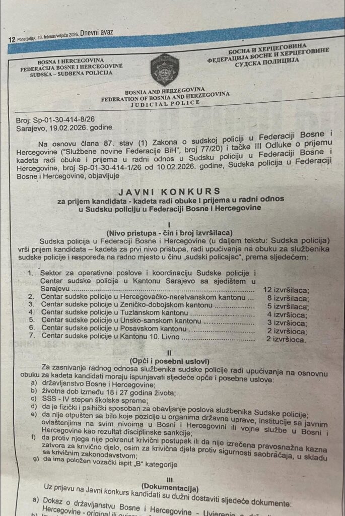 Prema objavljenom oglasu, prijem se vrši za prvi nivo pristupa, a kandidati će nakon uspješno završene obuke biti raspoređeni u čin sudskog policajca u više kantona.