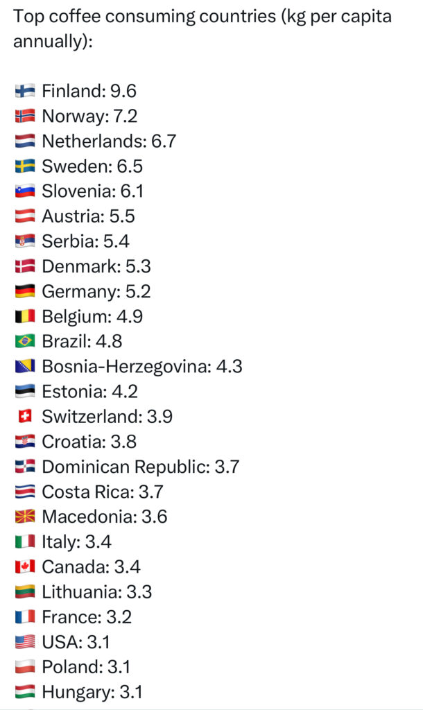 Stranica “World of Statistics” na društvenoj mreži X (nekadašnjem Twitteru) objavila je listu zemalja u kojima se popije najviše kilograma kafe po glavi stanovnika godišnje.