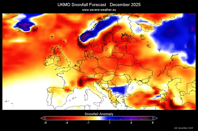 Mjesečna prognoza UKMO modela u velikoj se mjeri poklapa s evropskom. Decembar donosi izražene negativne anomalije, što potvrđuje ideju o sporijem početku snježne sezone.
