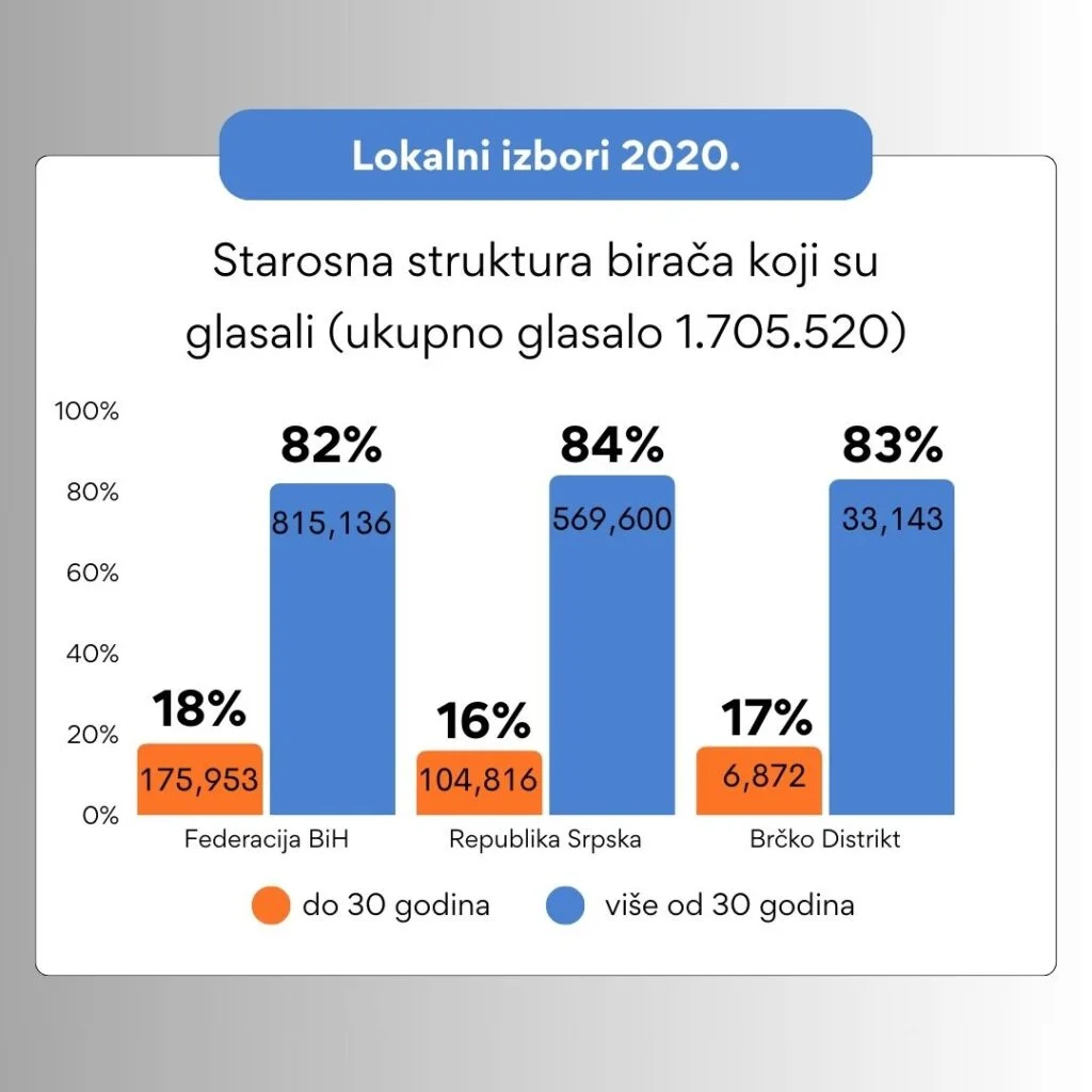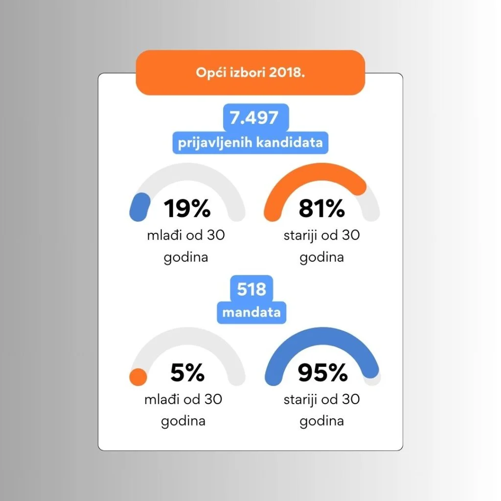 Statistika pokazuje da mladi ne glasaju za mlade. Kako smo naveli, mlađi od 30 godina osvojili su samo 5,21 posto mandata na Općim izborima 2018. godine iako je među biračima bilo skoro 16 posto građana iz te starosne kategorije.