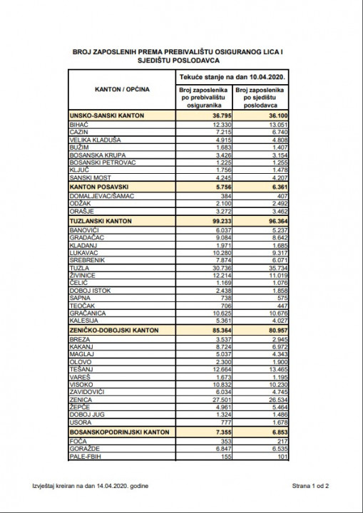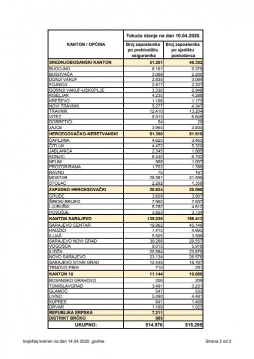 Kako su navodi, ukupan broj zaposlenih u ovom entitetu na dan 10. april 2020. godine po prebivalištu osiguranika iznosi 514.976, dok po sjedištu poslodavca ukupan broj zaposlenih iznosi 515.295.