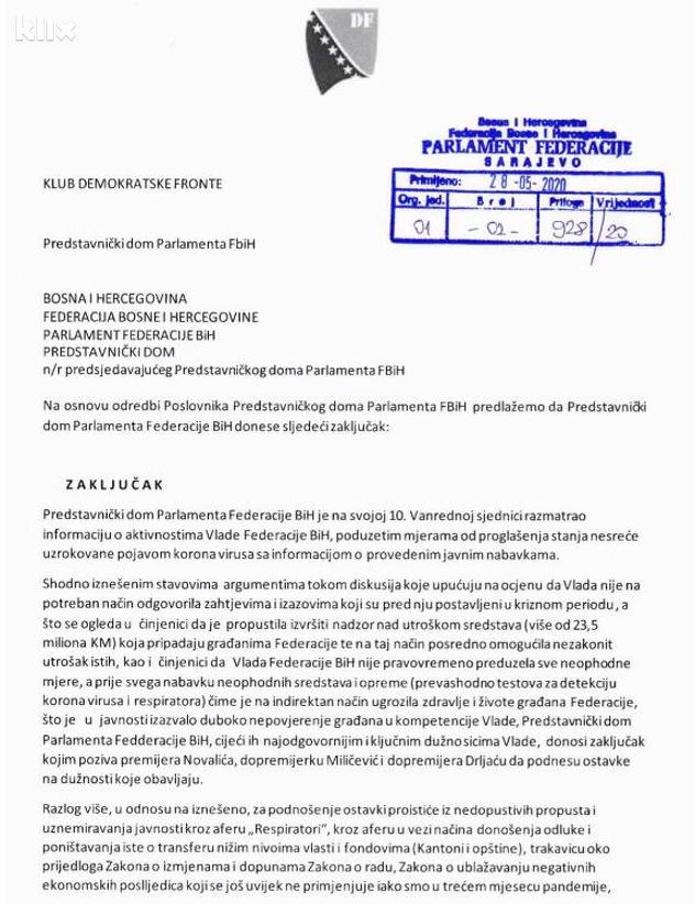Demokratska fronta predložila je Predstavničkom domu Parlamenta Federacije Bosne i Hercegovine donošenje zaključka kojim se traži ostavka premijera Fadila Novalića, ministrice finansija Jelke Milićević i ministra rada Veska Drljače.