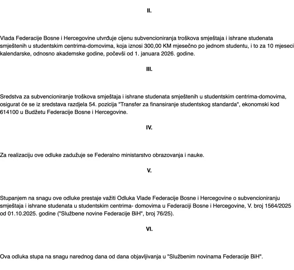 Vlada je, naime, utvrdila cijenu subvencioniranja troškova smještaja i ishrane studenata smještenih u studentskim centrima-domovima, koja iznosi 300 KM mjesečno po jednom studentu, i to za 10 mjeseci kalendarske, odnosno akademske godine, počevši od 1. januara 2026. godine.