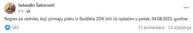 “Regres za radnike, koji primaju platu iz Budžeta ZDK biti će isplaćen u petak, 04.08.2023. godine”, napisao je Šatorović na svom Facebook profilu.